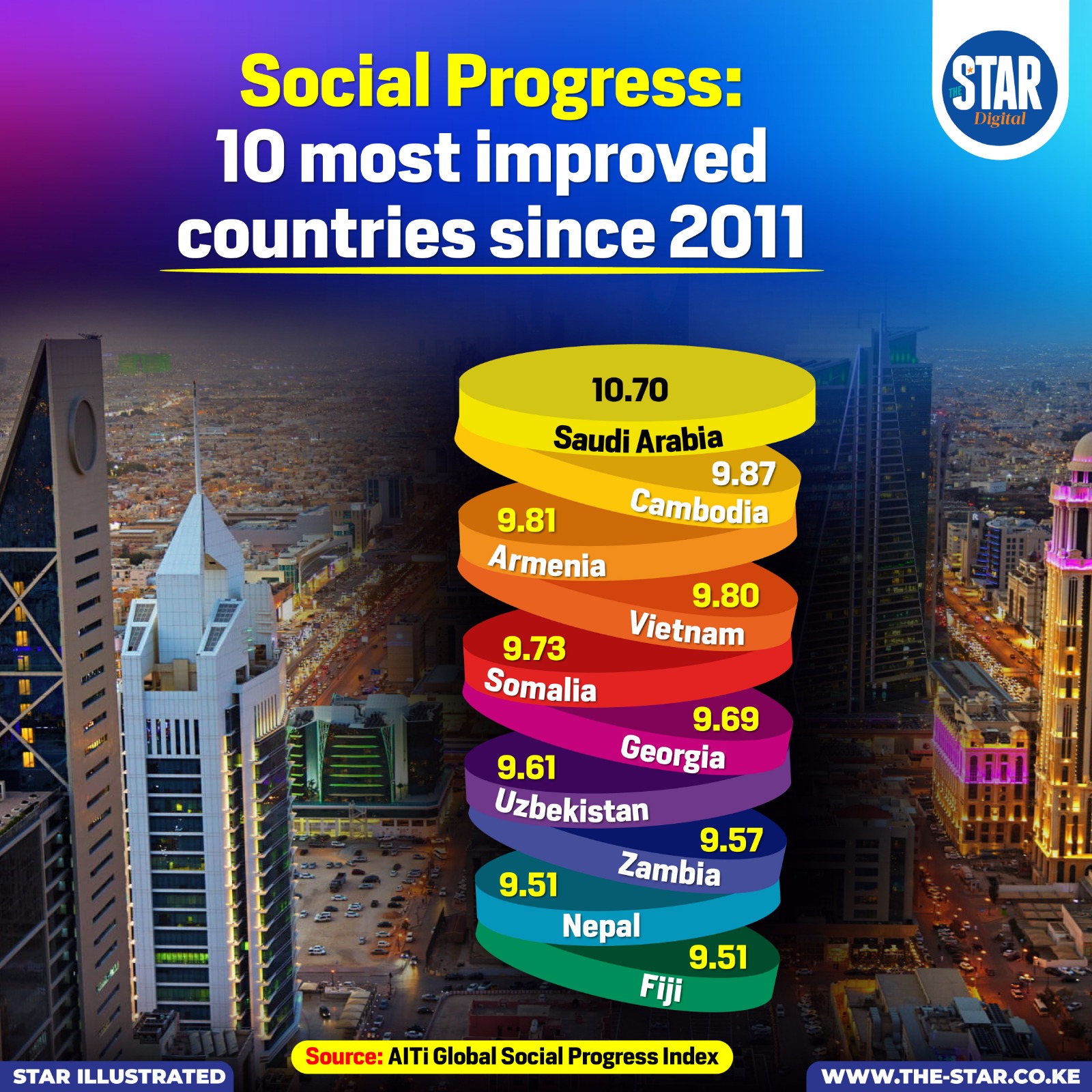 Saudi Arabia leads all countries with the biggest improvement in social progress since 2011, gaining about 10.70 points.