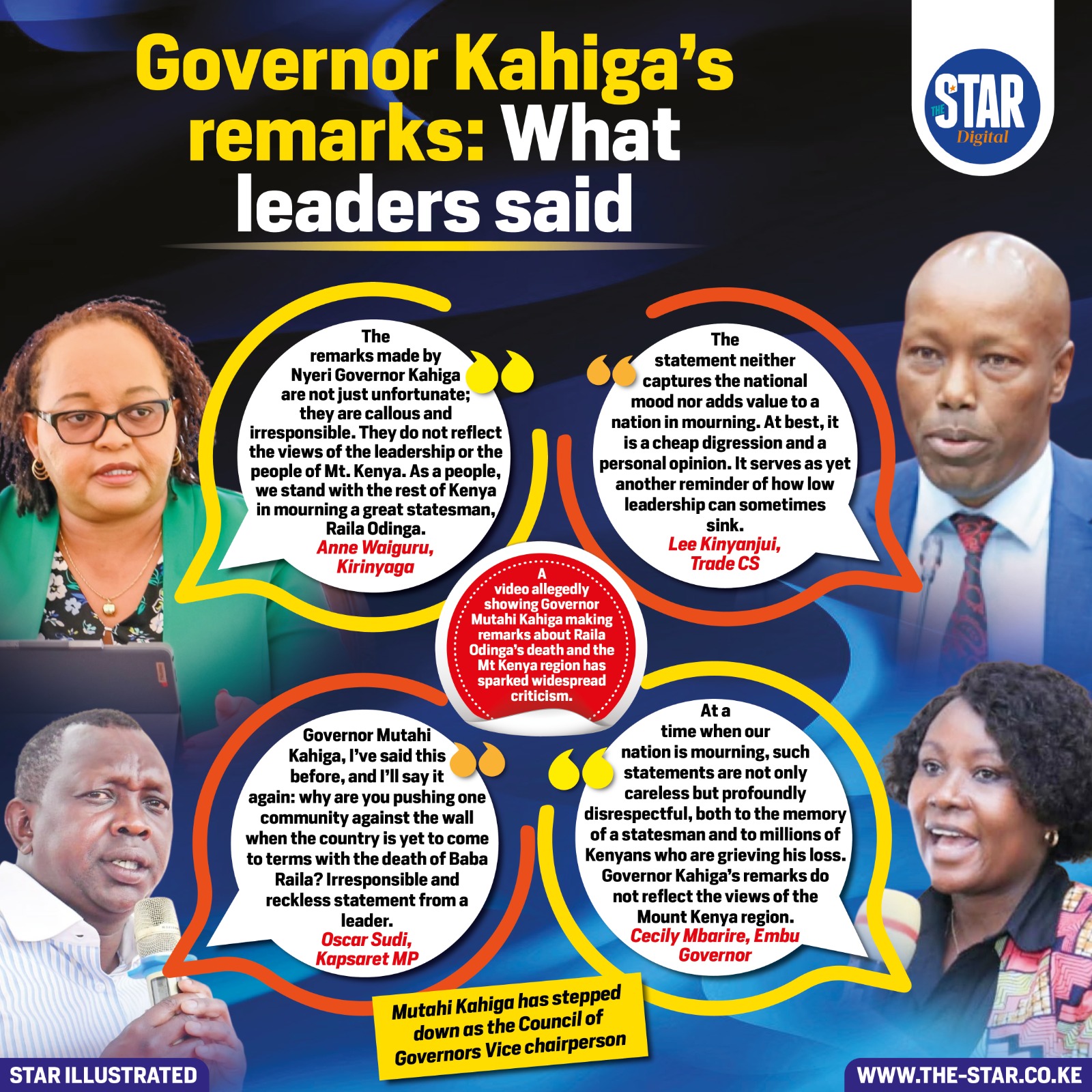 Kahiga has since stepped down as Vice Chairperson of the Council of Governors.