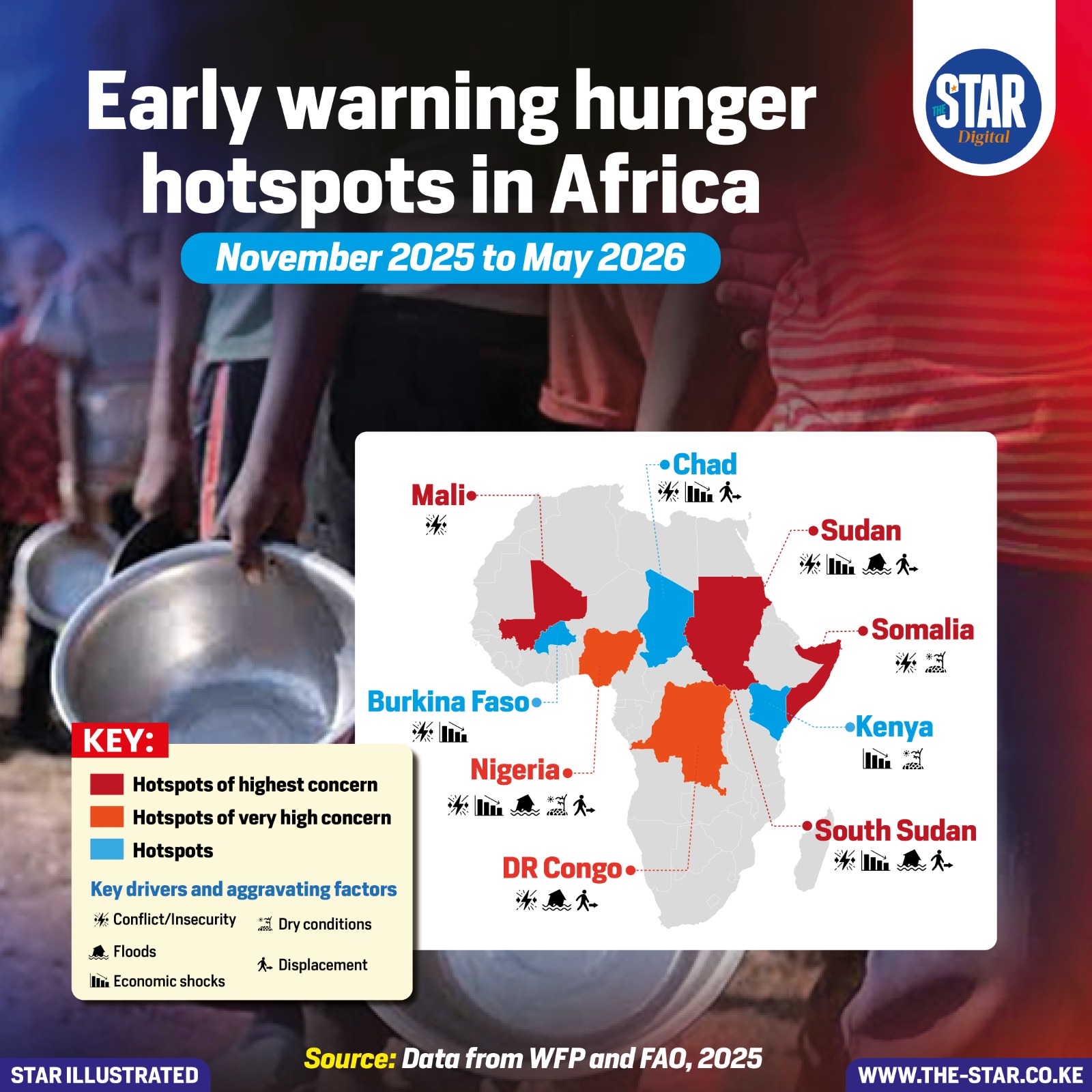 Several regions in Africa are identified as critical hunger hotspots between November 2025 and May 2026, driven by a convergence of severe factors. The map highlights three categories of concern: highest, very high, and general hotspots.